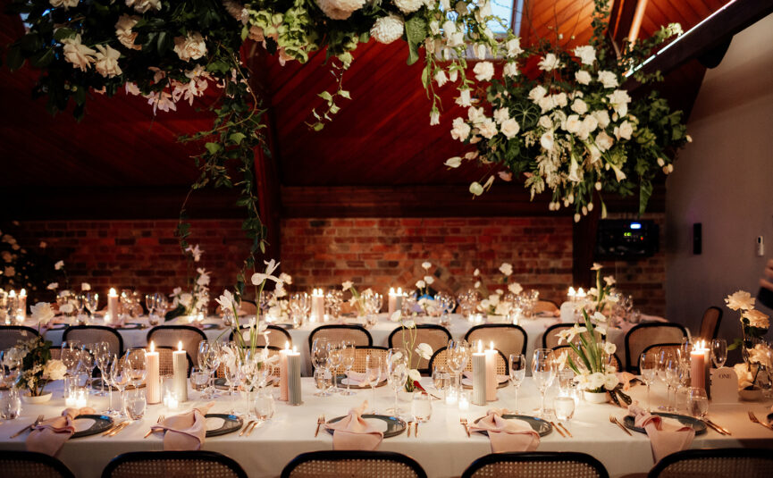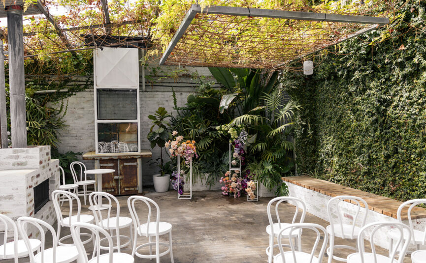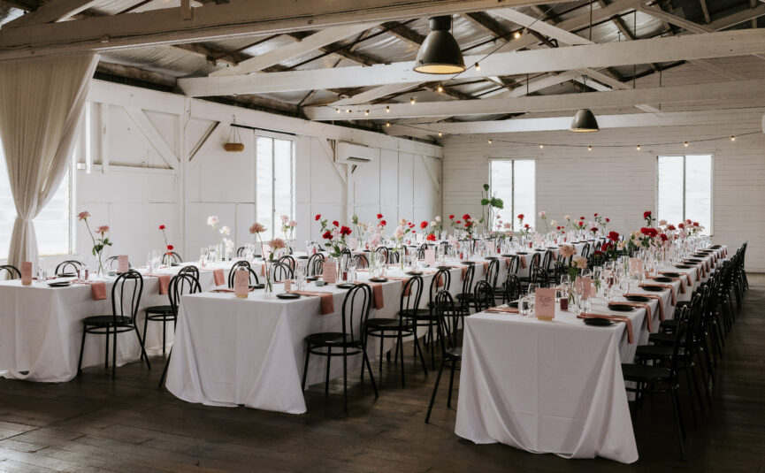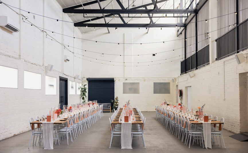 Weddings at The Button Factory usually run something like this – your ceremony will take place in The Garden room, offering a lush greenery backdrop, wood fire pizza oven, and abundant natural light streaming in. This space is gorgeous as is, but with the addition of some epic styling and florals, it really comes alive. With formalities out of the way, your guests will then head into The Gallery, a mere few steps away, where they will be surrounded by local art and enjoy roving canapés, bottles of bubbly and plenty of mingling before the reception kicks off.