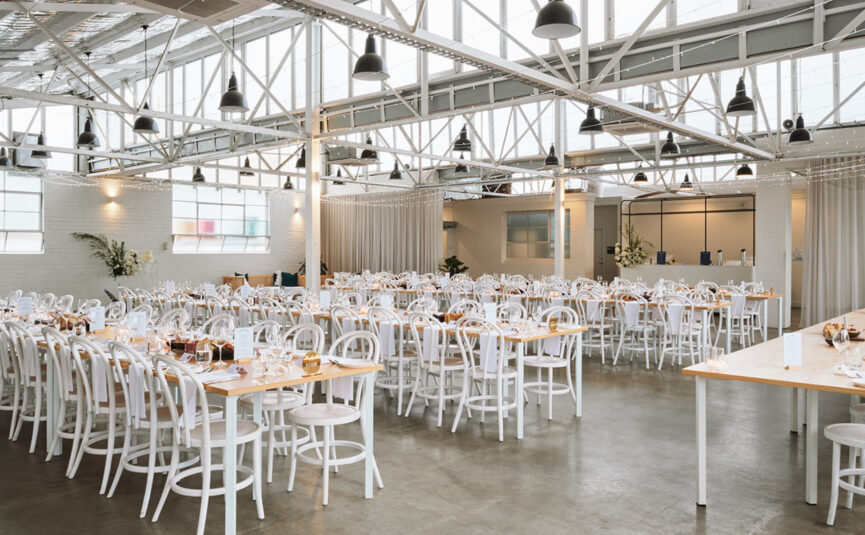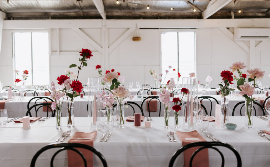 Have a think about what aesthetic you’re dreaming of and how it can tie into your venue. Perhaps you’re loving the sleek and classy soiree vibes that perfectly ties into a luxe wedding venue. Or maybe you’re looking for something more fun and whimsical that breathes personality into a warehouse venue.